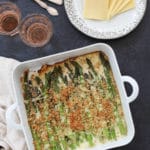 - Assemble the gratin. Place the asparagus in a medium baking dish (I like a 9” x 11” or9” x 13”) in an even layer. Pour the cream mixture on top of the asparagus and toss to evenly distribute. Sprinkle the asparagus with the remaining ½ cup Austrian Mountain cheese and the garlicky breadcrumbs.