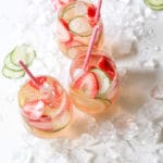 Since this spritzer is the epitome of a “dump and stir” batch cocktail, it’s ideal for entertaining a crowd. (Not to mention the fact that it looks quite fetching in your favorite pitcher/wine glasses.) I like to mix up a couple batches of the base (each batch serves 6) and let people top off their glasses with club soda—spritz yo’self! You can mix and serve the spritzers on the spot (hallelujah!), but if you want a stronger fruit/cucumber flavor, let the base hang out in the fridge for a couple hours beforehand.