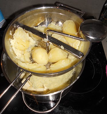 -Boil the potatoes until very tender. (To see if your potatoes are cooked, peirce them with a knife. If the knife slides in easily, those suckers are done.)
