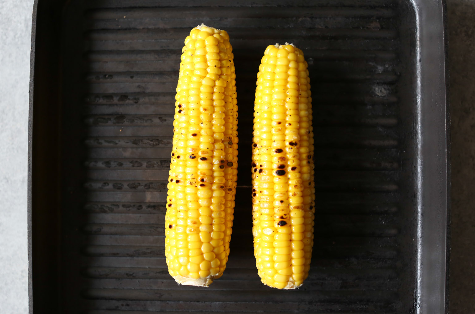 - Lightly brush the corn all over with olive oil and season with a little bit of salt. Place the ears of corn directly on the hot grill. Cook for 10-12 minutes, rotating the corn every 2-3 minutes, until the kernels deepen in color and are lightly charred in spots. Let cool slightly, then use a sharp knife to slice the kernels from each cob. Set aside.