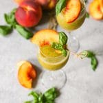 I’m extremely excited about today’s fancypants c-tail offering: Frozen Basil Bellinis. Like the majority of human women, I very much enjoy fruity frozen drinks during the sweatier months, but I’m not a fan of the crazy amount of refined sugar (and additives) hiding in most restaurant versions and store-bought mixes. So, in an effort to avoid the express train to Hangover/Bloat City, I often play frozen mixologist with my favorite booze, real fruit, and the occasional soft herb. Last year’s go-to was the Frozen Rosé Sangria from The Dude Diet, but this summer I’m all about the frozen champagne cocktails, and this basil Bellini is my favorite to date.