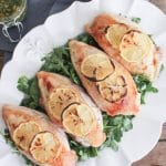 - Place the stuffed chicken breasts into a baking dish. Rub the skin of each breast with a little bit of olive oil and season generously with salt and pepper. Place two thin slices of lemon on top of each breast and bake for 30 minutes until the skin is lightly browned and the chicken is cooked through. (If you’re scared of undercooking, whip out your handy meat thermometer and insert it into the thickest part of the breast and make sure that it read 165 degrees F.)