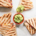 - Slice each quesadilla into 3 triangles and serve immediately. Get some guacamole involved if you’re feeling festive.