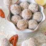 My first energy bites were these pumpkin-dark chocolate numbers, and since then, I’ve gotten dirty with lots of exotic balls. (Do you hate me yet?) All have been delightful in their own way, but two recipes stand head and shoulders above the rest. One is a faux cookie dough situation that’s going in The Dude Diet book (look forward to that in…6.5 months), and the second is this lemon-coconut combo.
