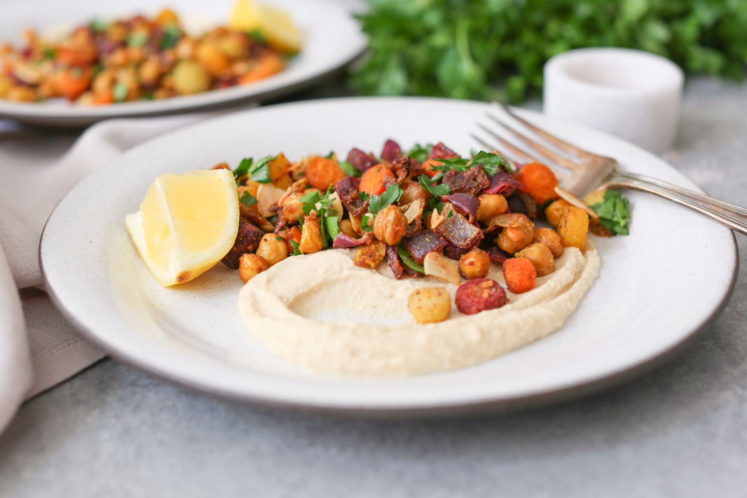 - -Stir in the toasted almonds and parsley, and serve alone or over hummus (or greens!) with an additional squeeze of lemon.