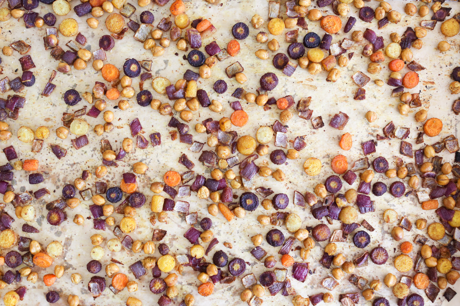 - -Pre-heat the oven to 425 degrees. Line a rimmed baking sheet with parchment and set aside. Cut the carrots into ¼-inch rounds, and place them on the baking sheet along with the onion, chickpeas, and coconut oil. Toss well and add the spices, salt, and pepper.