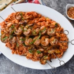 - Remove the shrimp from the marinade, and thread 6 to 7 shrimps onto each skewer. (If your skewers are small, thread fewer shrimp per skewer.) You want the skewer to pierce each shrimp twice, once just above the tail shell and once near the head, to form a tight c-shape.