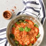 I tend to favor frittatas over omelettes for the sake of ease (no flipping/rolling necessary), and this one’s a winner, friends. Loaded with greens (always), spread generously with marinara, and topped with bubbling mozzarella, Parmesan, and crispy bread crumbs, it’s essentially an eggy—and eggstremely delicious (had to)—personal pizza. Better still, it couldn’t be easier. The whole shebang comes together in about 15 minutes from start to finish. For real.
