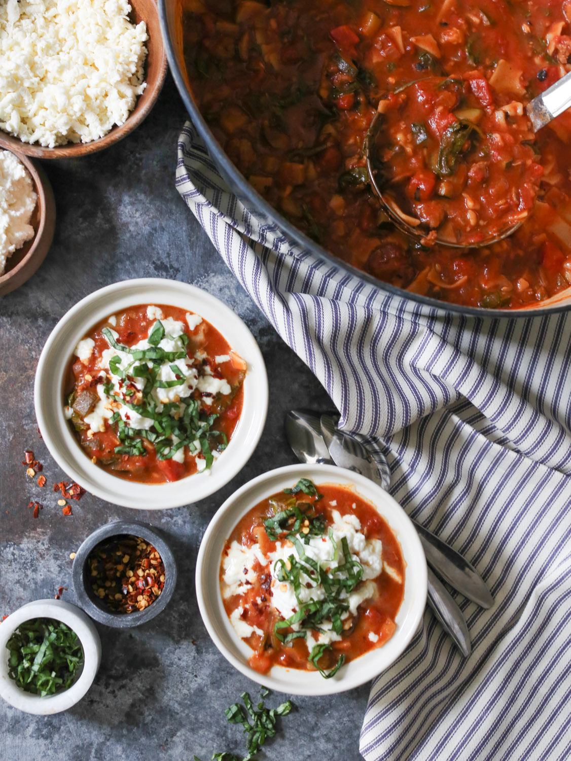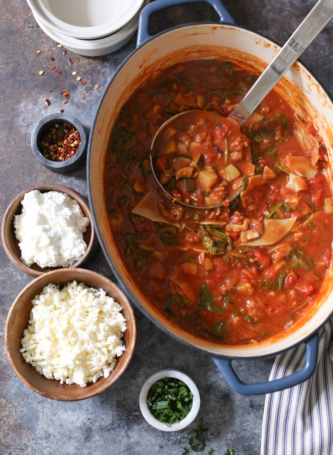 I’ve been making some version of this soup for years now, and I’m pumped to finally share its wonders with all of you. The one-pot recipe delivers all the badass, comforting flavors of lasagna (Noodles! Meaty tomato sauce! Melting cheese!) without the gut-busting consequences or major time commitment. Plus, the lightened up ingredient list—which includes lean turkey sausage, zucchini, mushrooms, brown rice lasagna noodles, plenty of nutrient-dense kale, and a responsible amount of cheese—leaves you feeling simultaneously satisfied and well-nourished. Joy of joys!! Better still, the whole shebang comes together in about 40 minutes, and it’s absolutely impossible to screw up. Cross my heart.