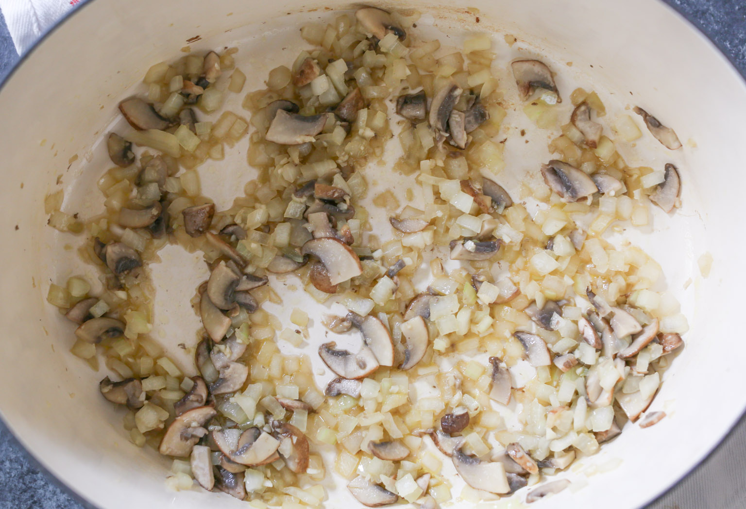 - Heat the olive oil in a medium Dutch oven or heavy-bottomed soup pot over medium heat. When the oil is hot and shimmering, add the onion, mushrooms, and garlic. Cook for 4-5 minutes until the onions are soft and translucent, and the mushrooms have released most of their liquid.