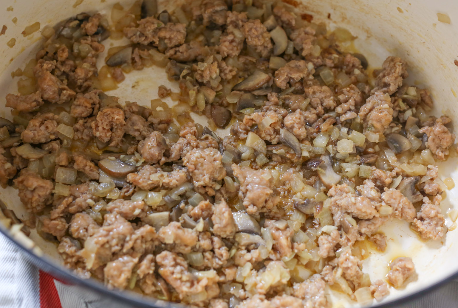- Add the sausage to the pan and cook, breaking the meat up into smaller pieces with a spatula, until no longer pink. (About 4-5 minutes.)