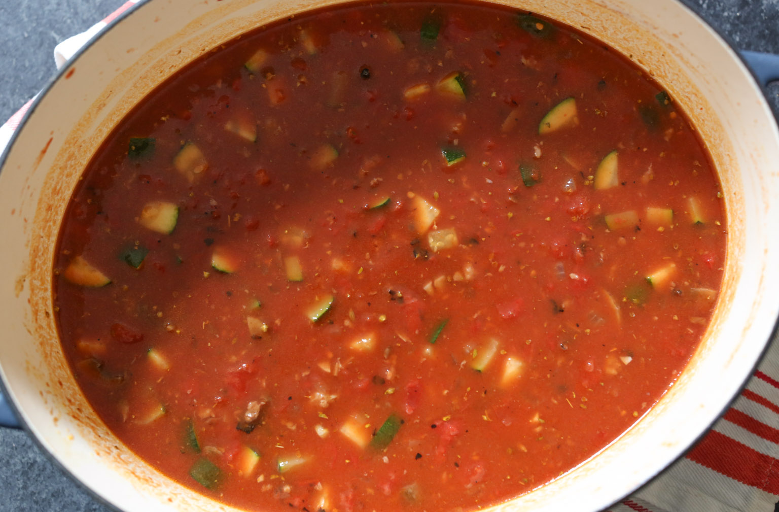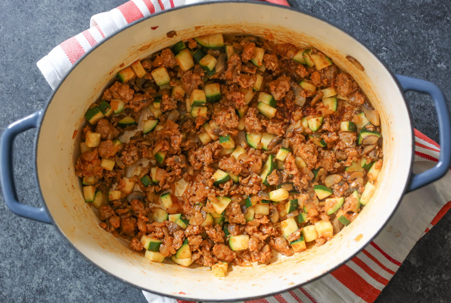 - Add the zucchini and tomato paste and cook for 1 minute, just to mellow the acidity of the tomato paste. Add the red wine and cook for a minute or so until the liquid has evaporated. (We’re deglazing here, people, so be sure to scrape up any delicious browned bits from the bottom of the pan.)