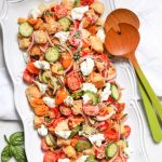 In case you’re not familiar with its wonders, panzanella is a Tuscan bread salad that’s usually made with chunks of dried bread tossed with ripe tomatoes, olive oil and vinegar. The bread gets saturated (but still retains a little crunch) with the tomato juices and dressing, and the result is a highly textured, vibrant taste treat that is so much more than the sum of its parts. This version incorporates sweet nectarines (my go-to summer stone fruit), crunchy cucumbers, fresh basil, and plenty of creamy mozzarella. It’s a fabulous light meal on its own, but it’s also the perfect side for summer picnics and barbecues, since it comes together quickly/travels extremely well. (And while it doesn’t photograph in the sexiest way, it’s actually quite the showstopper in person. Promise.)