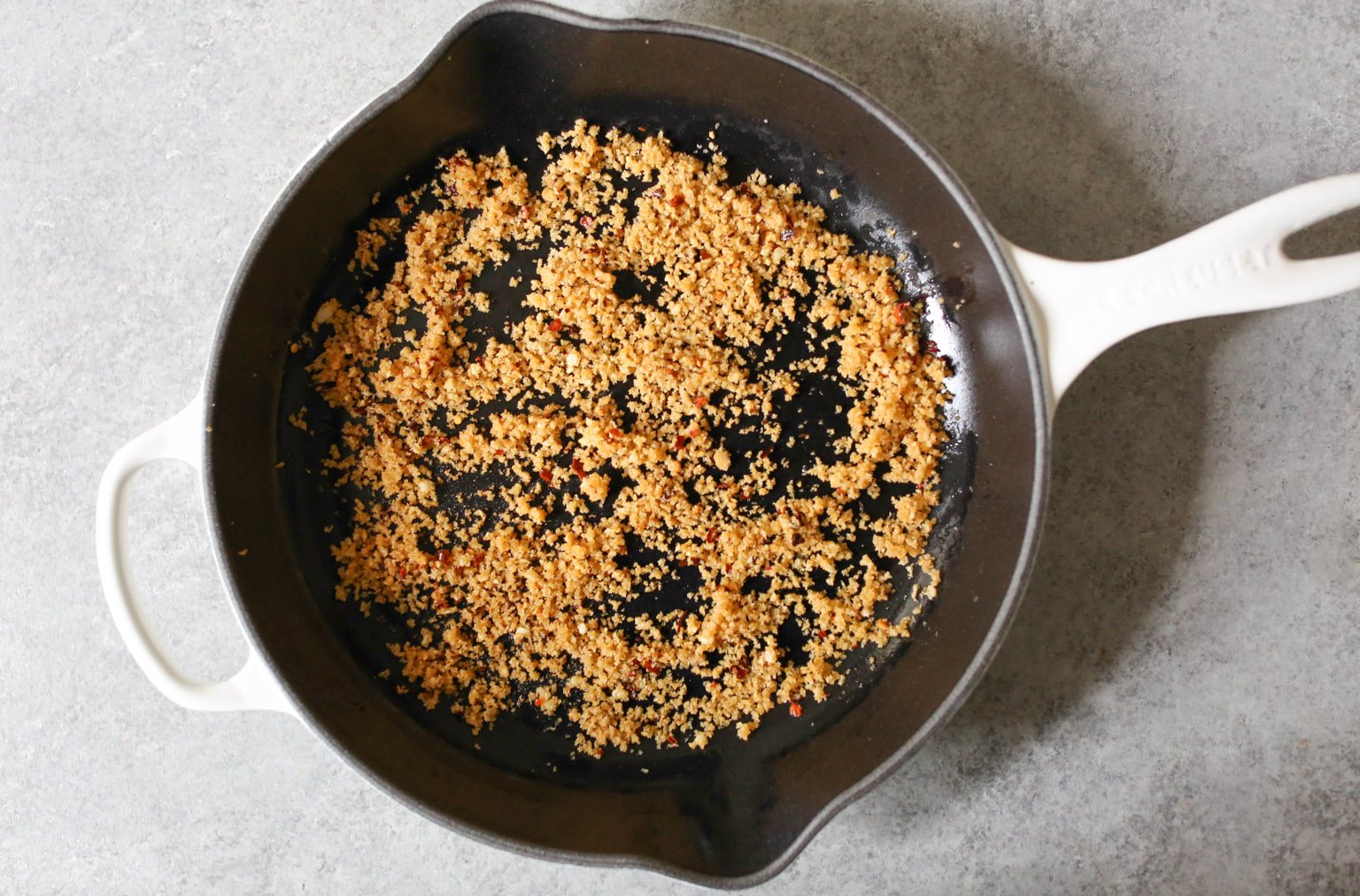 - While the quinoa cooks, prep the panko topping. Heat 2 teaspoons of olive oil in a large ovenproof skillet or sauté pan over medium heat. When the oil is hot and shimmering, add the garlic and red pepper flakes and cook just until the garlic begins to turn golden, about 30 seconds. (Be very careful not to let the garlic burn, friends!) Add the breadcrumbs and cook, stirring regularly until they darken a shade in color and smell toasty, about 2 minutes. Transfer the topping to a bowl and set aside.