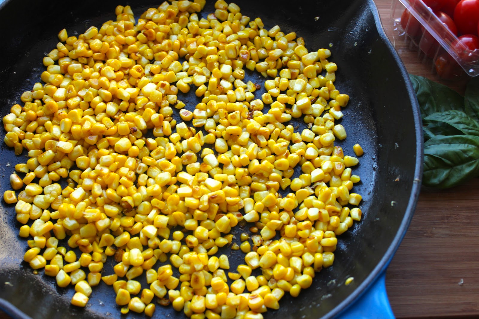 -Heat 1 tbsp olive oil in a cast iron skillet. When hot, add the corn and sauté for 8-10 minutes until the corn is tender and well browned. Transfer the cooked corn to a large mixing bowl and let cool to room temperature.